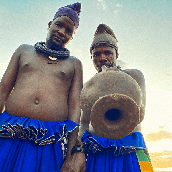 We had to stress multiple times that we did not want the musicians to don touristic tribal costumes— quite possibly the first music project in history that urged performers to cover-up rather than pleading with artists to expose more flesh. But it was to no avail. When the assigned hour arrived, the men all ditched the baseball caps and soccer jerseys that they routinely wear. And for the women, the reality is that they almost without exception keep their torsos bare, even in winter. We had to acquiesce. Forcing the issue would have only been the flipside of inauthenticity. The featured, traditional instrument is the Cattle Gun. It’s rarely found these days and therefore, costly. Made from the lengthy horn of an Oryx and coated in mud, it is blown, resulting in a breathy, rattled tone. Via the use of live looping on three of the album’s tracks, psychedelic vocal tapestries were created as if snatched from the ever-shifting skies that enshrined the valley from all sides. But even more esoteric results arose from members cupping hands over mouth to create chorusing and flanging effects sans electricity or gear. Rather than "primitive" or traditional, the Himba music making is imbued with innovation and timelessness."